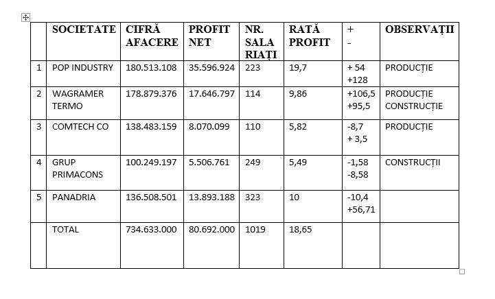 Cele 5 ”SRL-uri” au declarat un profit net în valoare de 80.692.000 lei, cu o rată medie a profilului de 18,65 la sută.