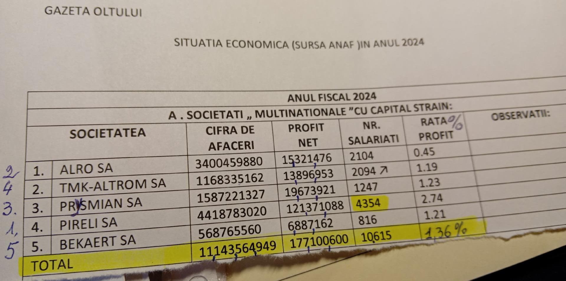 Toate multinaționalele de pe platforma industrială a Slatinei au raportat un profit de 177 milioane lei la o cifră de afaceri de peste 11 miliarde lei, cu o rată a profitului de 1,36%. Este surprinzător să constați faptul că 3 societăți comerciale ”SRL-uri”, fiecare în parte, au profit mai mare decât ALRO SA, TMK-ARTROM sau BEKAERT și PRYSMIAN.