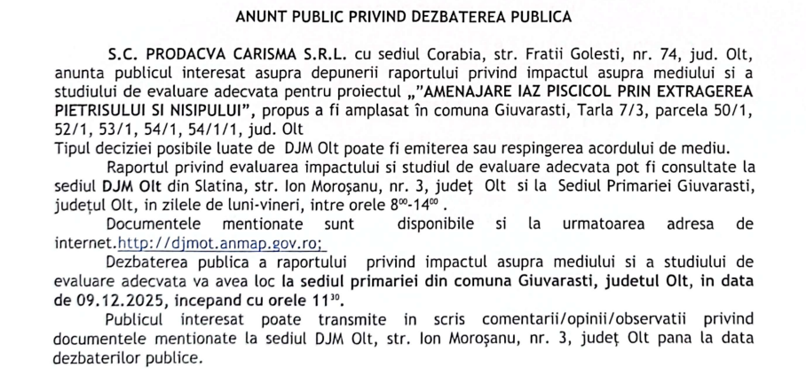 Anunțuri Anunț By: Gazeta Oltului Redactia Date: 5 noiembrie 2025 11:18 Articolul precedentCând va fi eliberat din închisoare Darius Vâlcov?Articolul următorHoroscop zilnic 5 noiembrie 2025 Gazeta Oltului Redactiahttps://www.gazetaoltului.ro Distribuie FacebookTwitterPinterestWhatsApp Anunțuri Anunț Anunţ public privind decizia etapei de încadrare – S.C. OMV PETROM MARKETING S.R.L. Anunț – S.C. VIENNA ENERGY FORTA NATURALA S.R.L Anunț – OMV PETROM MARKETING Anunț – ECOREP SCRAPP SRL More like thisRelated Anunț Gazeta Oltului Redactia - 19 decembrie 2025 11:56 Anunţ public privind decizia etapei de încadrare – S.C. OMV PETROM MARKETING S.R.L. Gazeta Oltului Redactia - 19 decembrie 2025 09:34 Anunţ public privind decizia etapei de încadrare S.C. OMV PETROM... Anunț – S.C. VIENNA ENERGY FORTA NATURALA S.R.L Gazeta Oltului Redactia - 19 decembrie 2025 09:33 Anunţ public privind decizia etapei de incadrare S.C. VIENNA ENERGY ... Anunț – OMV PETROM MARKETING Gazeta Oltului Redactia - 19 decembrie 2025 07:15 S.C. OMV PETROM MARKETING S.R.L. titular al proiectului „CONSTRUIRE...
