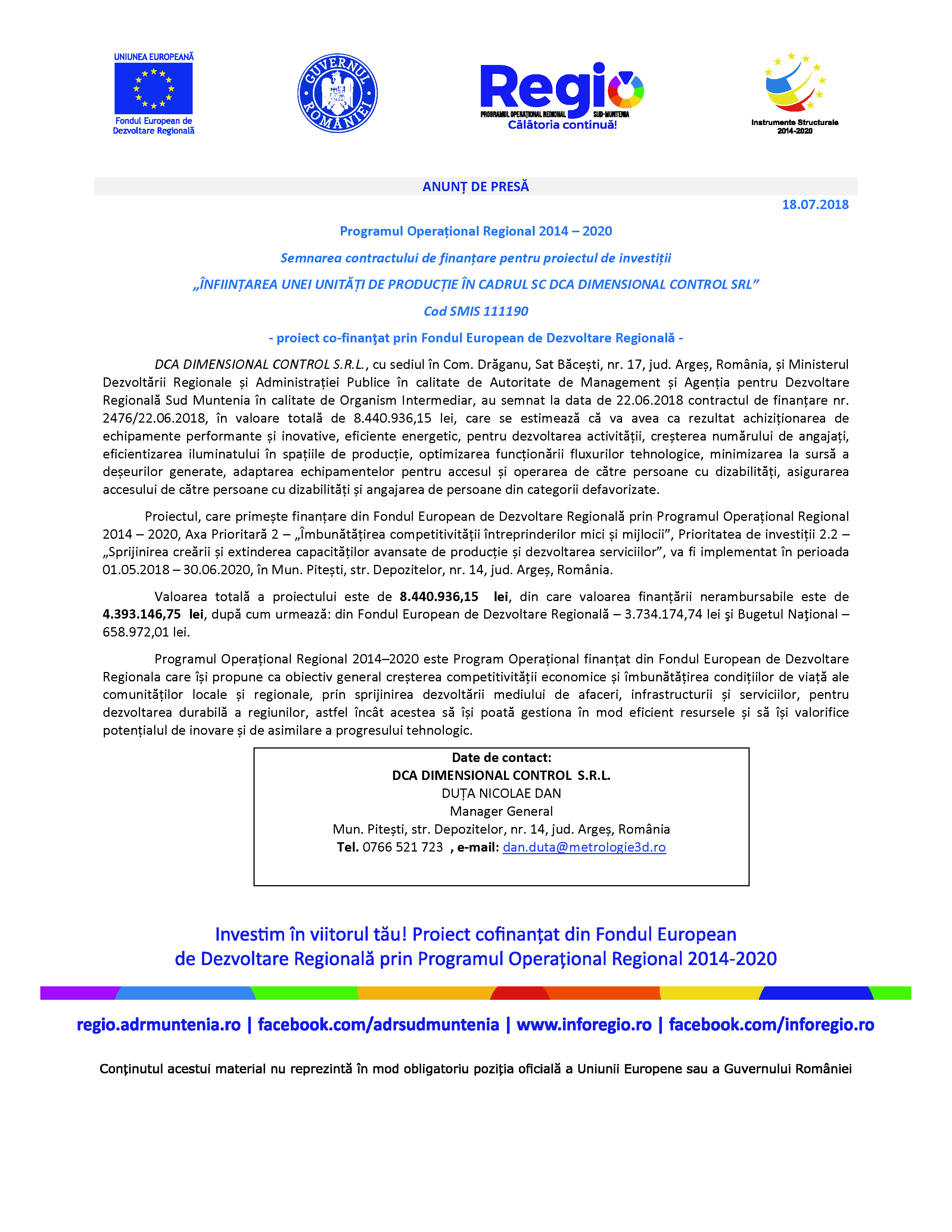 DCA DIMENSIONAL CONTROL S.R.L., cu sediul în Com. Drăganu, Sat Băcești, nr. 17, jud. Argeș, România, și Ministerul Dezvoltării Regionale și Administrației Publice în calitate de Autoritate de Management și Agenția pentru Dezvoltare Regională Sud Muntenia în calitate de Organism Intermediar, au semnat la data de 22.06.2018 contractul de finanțare nr. 2476/22.06.2018, în valoare totală de 8.440.936,15 lei, care se estimează că va avea ca rezultat achiziționarea de echipamente performante și inovative, eficiente energetic, pentru dezvoltarea activității, creșterea numărului de angajați, eficientizarea iluminatului în spațiile de producție, optimizarea funcționării fluxurilor tehnologice, minimizarea la sursă a deșeurilor generate, adaptarea echipamentelor pentru accesul și operarea de către persoane cu dizabilități, asigurarea accesului de către persoane cu dizabilități și angajarea de persoane din categorii defavorizate.