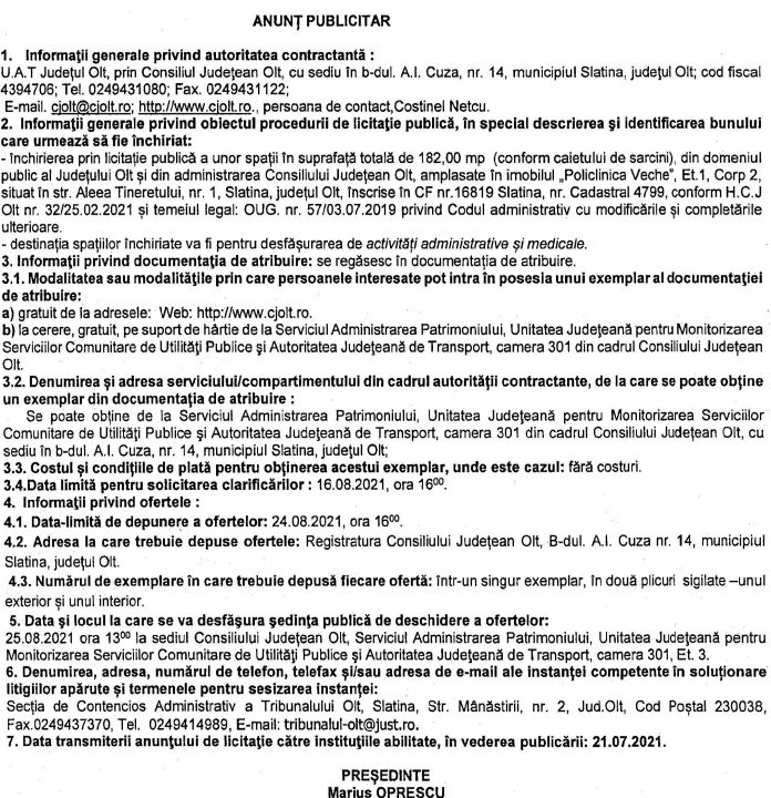 Anunțuri Anunț Licitație De către Gazeta Oltului Redactia - 21 iulie 2021 07:00 0 99 FacebookTwitterPinterestWhatsApp