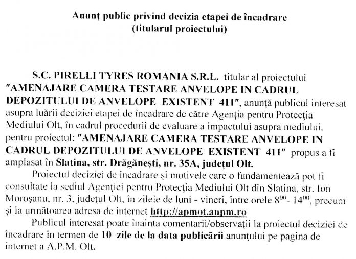 Anunțuri Anunț Mediu Pirelli De către Gazeta Oltului Redactia - 19 mai 2021 12:17 0 124 FacebookTwitterPinterestWhatsApp