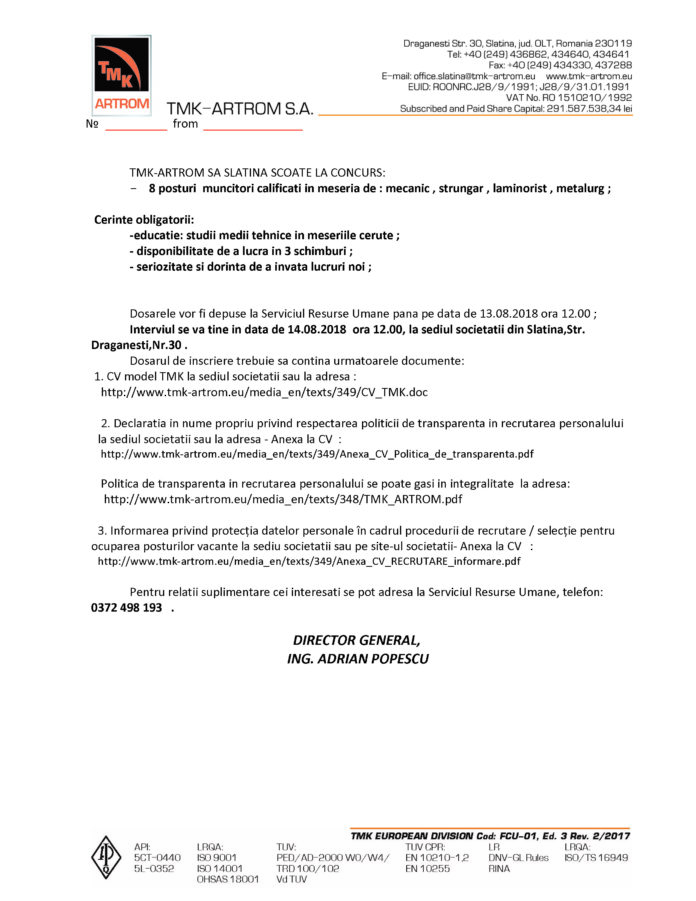 Anunțuri Anunț TMK De către Gazeta Oltului Redactia - 8 august 2018 09:57 0 530 FacebookTwitterPinterestWhatsApp