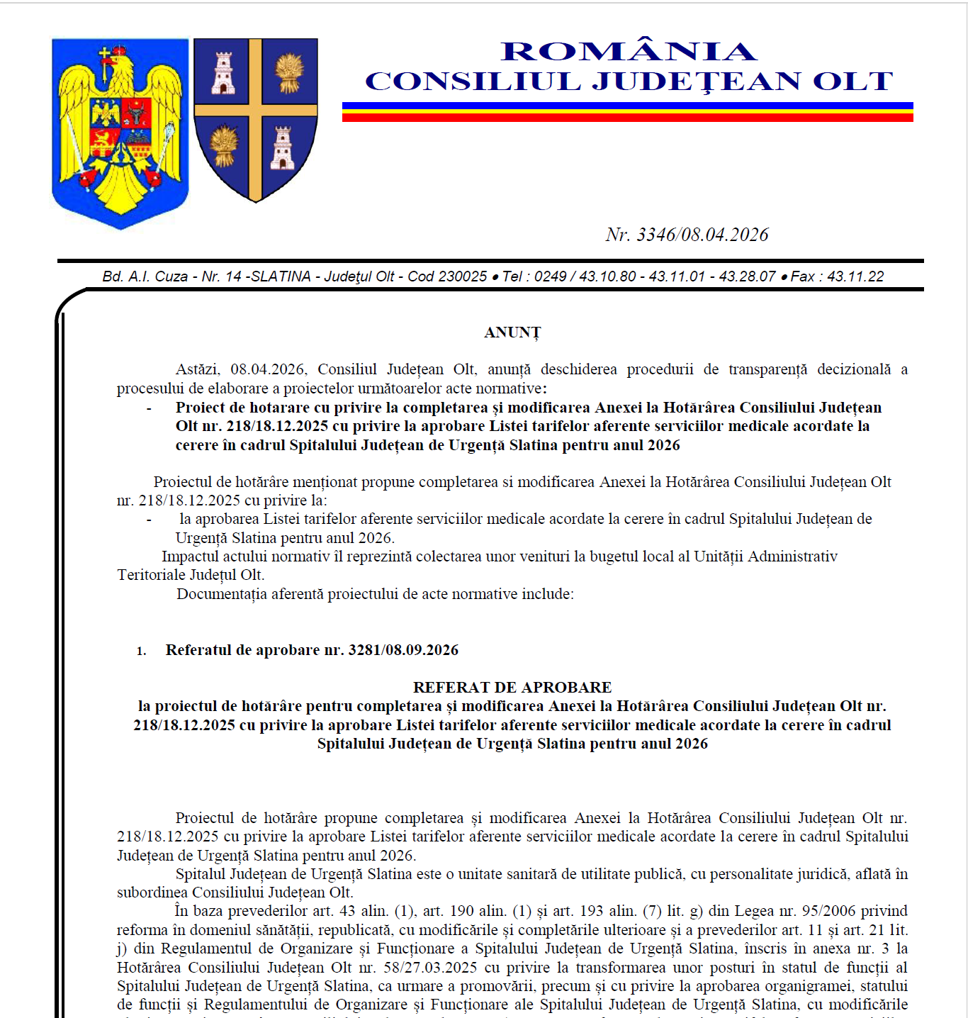 Anunțuri Deschiderea procedurii de transparență decizională a procesului de elaborare a proiectelor De către Gazeta Oltului - 8 aprilie 2026 17:41 0 2 FacebookXPinterestWhatsApp Anunt Nr. 3346/08.04.2026