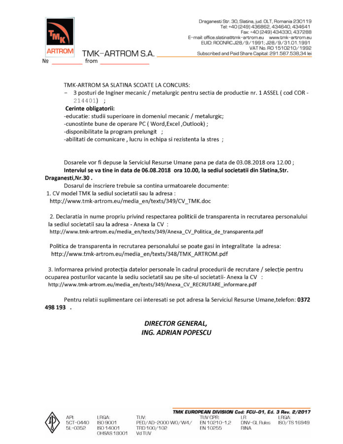 Anunțuri TMK-ARTROM SA SLATINA SCOATE LA CONCURS: De către Gazeta Oltului Redactia - 26 iulie 2018 13:20 0 823 FacebookTwitterPinterestWhatsApp