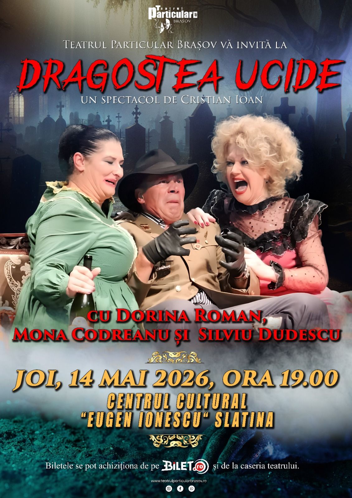 Joi, 14 mai, de la ora 19:00, la Centrul Cultural „Eugen Ionescu” din Slatina, este programat spectacolul „Dragostea ucide”, o producție de teatru cu elemente de comedie neagră și mister.