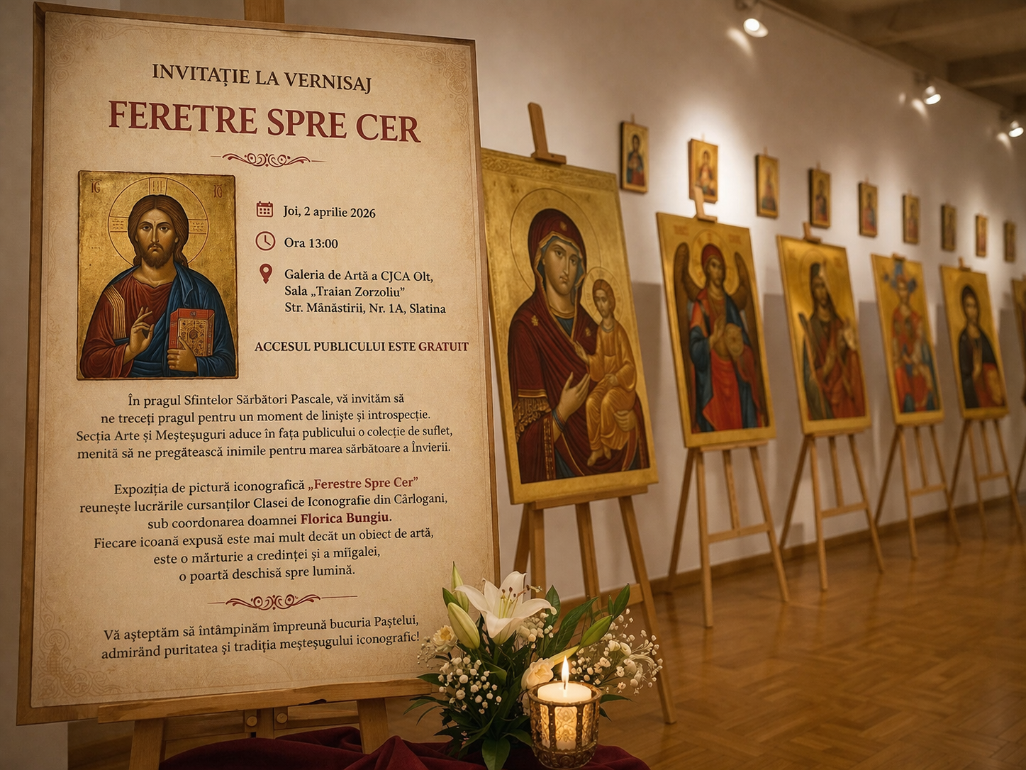 „Ferestre Spre Cer” propune astfel o incursiune în universul picturii iconografice realizate de cursanți, într-un moment în care spațiul expozițional din Slatina devine loc de întâlnire între public, artă sacră și apropierea unei mari sărbători creștine. Evenimentul este deschis tuturor celor interesați să descopere lucrări inspirate din tradiția iconografică și să participe la vernisaj în mod gratuit.