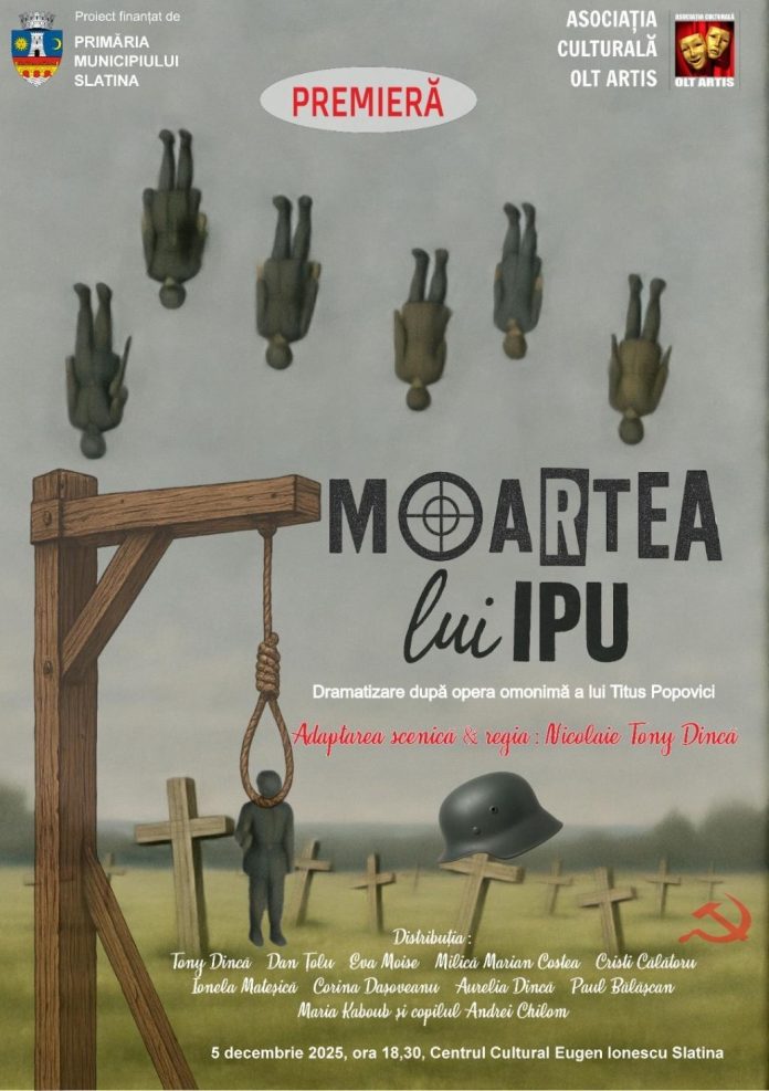 Vineri, 5 decembrie 2025, începând cu ora 18.30, va avea loc premiera specatacolului de teatru cu piesa „Moartea lui Ipu” pusă în scenă de Asociația Culturală „Olt Artis” din Slatina. Accesul în sală se va face pe bază de invitații, care vor putea fi găsite la casa de bilete a centrului cultural, începând cu ziua de 2 decembrie 2025.