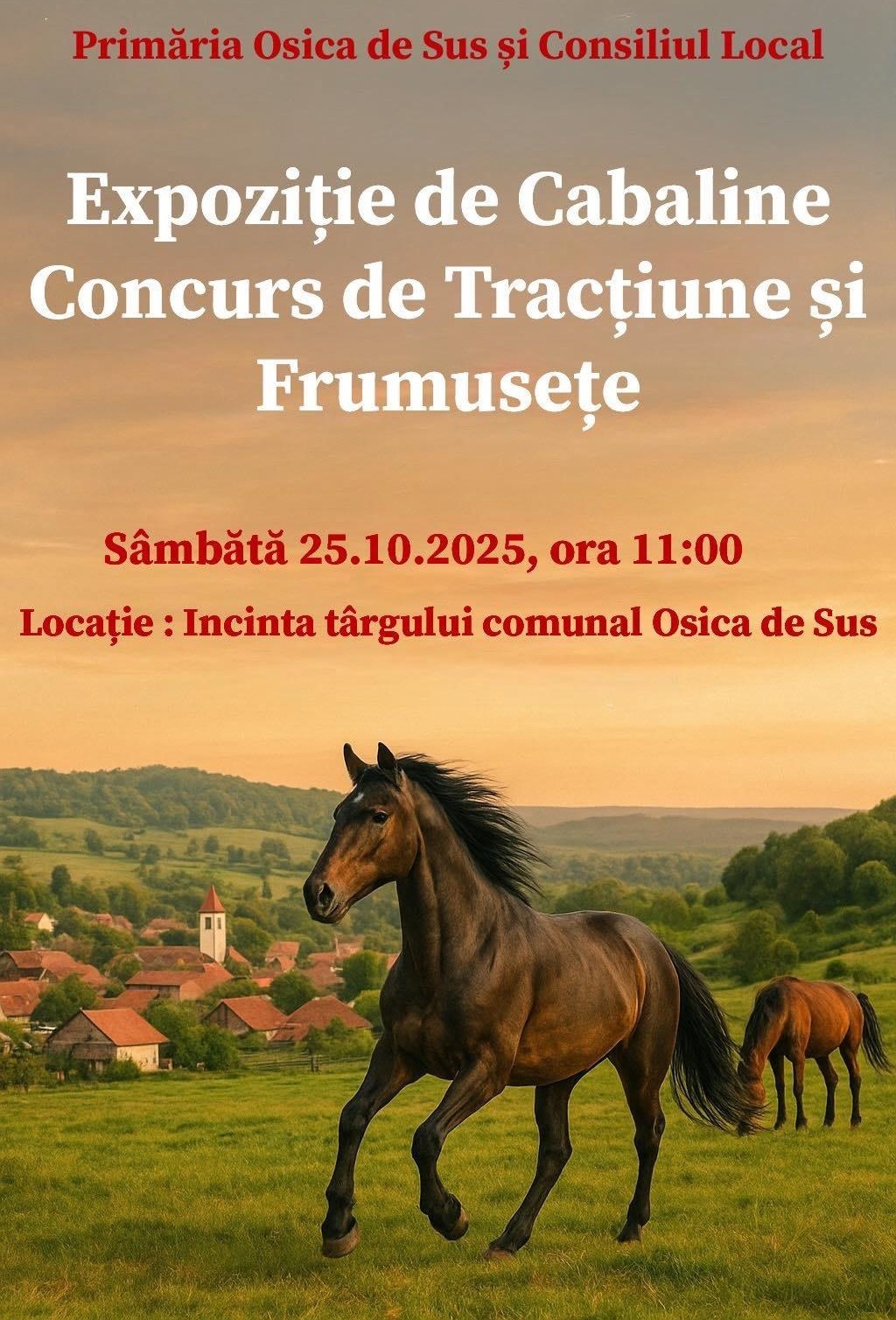 ”Sâmbătă, 25 octombrie 2025, ora 11:00 – vă așteptăm la Târgul Comunal din Osica de Sus la Expoziția de Cabaline – Concurs de Tracțiune și Frumusețe! Vino să vezi cei mai frumoși și puternici cai din zonă și să petreci o zi plină de tradiție și spectacol!” este mesajul edilului Cezar Filip.