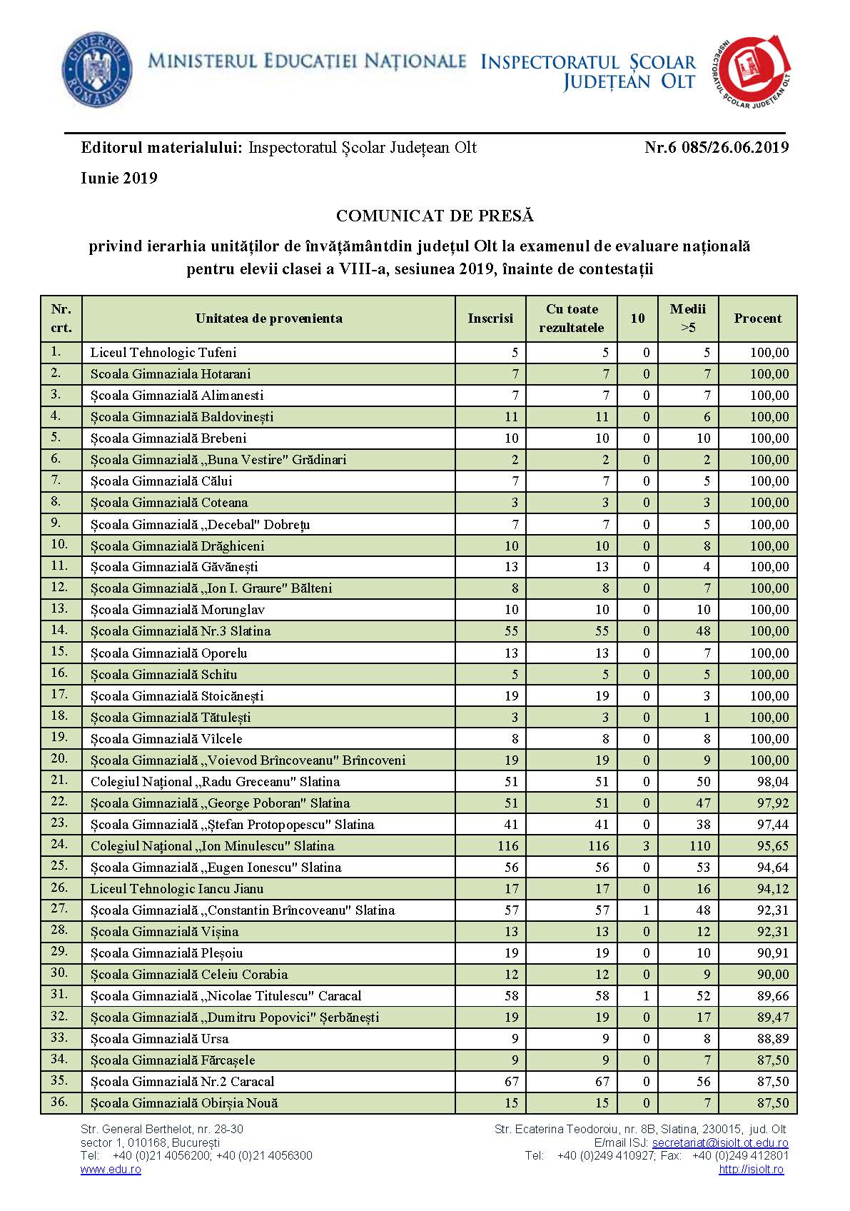 Iată ierarhia completă a unităților de învățământ din județul Olt la examenul de evaluare națională pentru elevii clasei a VIII-a, sesiunea 2019, înainte de contestații, ierarhie întocmită de ISJ Olt: