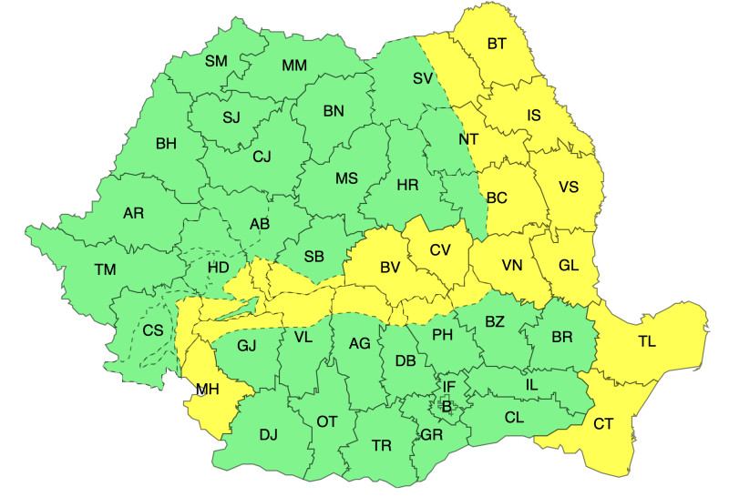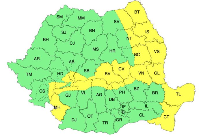 Un cod galben de vânt puternic va intra în vigoare sâmbătă dimineață, la ora 05:00, și va fi valabil până la ora 23:00, în zona Carpaților Meridionali și a Carpaților de Curbură, iar o altă avertizare, tot cod galben, de vânt va fi valabilă în Moldova, Dobrogea, sud-estul Transilvaniei și vestul Olteniei, tot sâmbătă, în intervalul orar 09:00 – 18:00. La București, sunt posibile ploi slabe în prima parte a zilei de sâmbătă, anunță stiripesurse.ro.