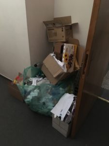 Încă multe alte surori consumate ale țigării de mai devreme zac în scrumiere pe pervazurile holurilor instituției. Ridic privirea să urc scările și observ pereții scorojiți și mă gândesc ce bine că n-am trecut pe sub ei să-mi cadă vreo bucată de tencuială în cap. Merg pe un hol înspre unde-am treabă și, după o ușă, stă ascunsă o grămadă de gunoaie, de care mă și sperii.