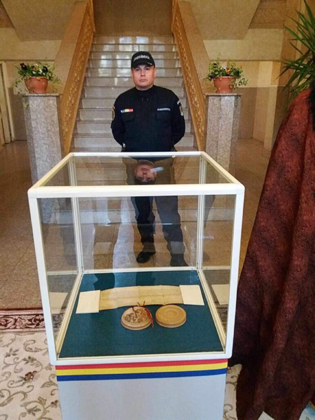 Reprezentantul Arhivelor Naționale Olt este persoana care a însoțit și va însoți alături de un echipaj al Jandarmeriei documentul de la și la Brasov, după această expunere la Slatina.