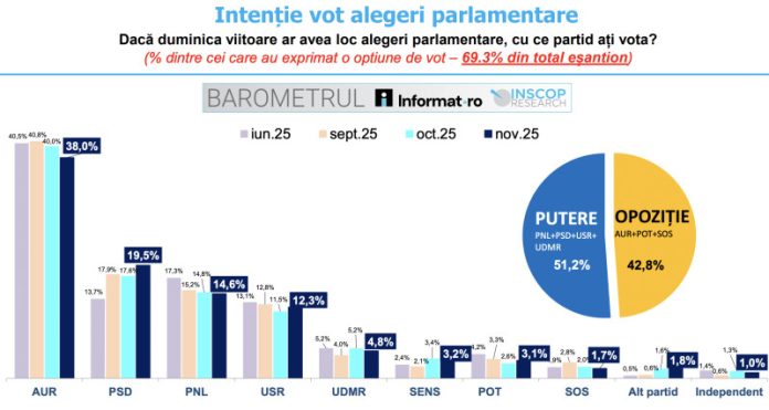 Dacă duminica viitoare ar avea loc alegeri parlamentare, Alianța pentru Unirea Românilor ar conduce clasamentul, cu 38% dintre opțiunile de vot. Formațiunea condusă de George Simion înregistrează o scădere, după ce în lunile iunie, septembrie și octombrie s-a clasat la peste 40% în preferințe și este urmată de PSD, cu 19,5%, PNL cu 14,6% și USR cu 12,3%.