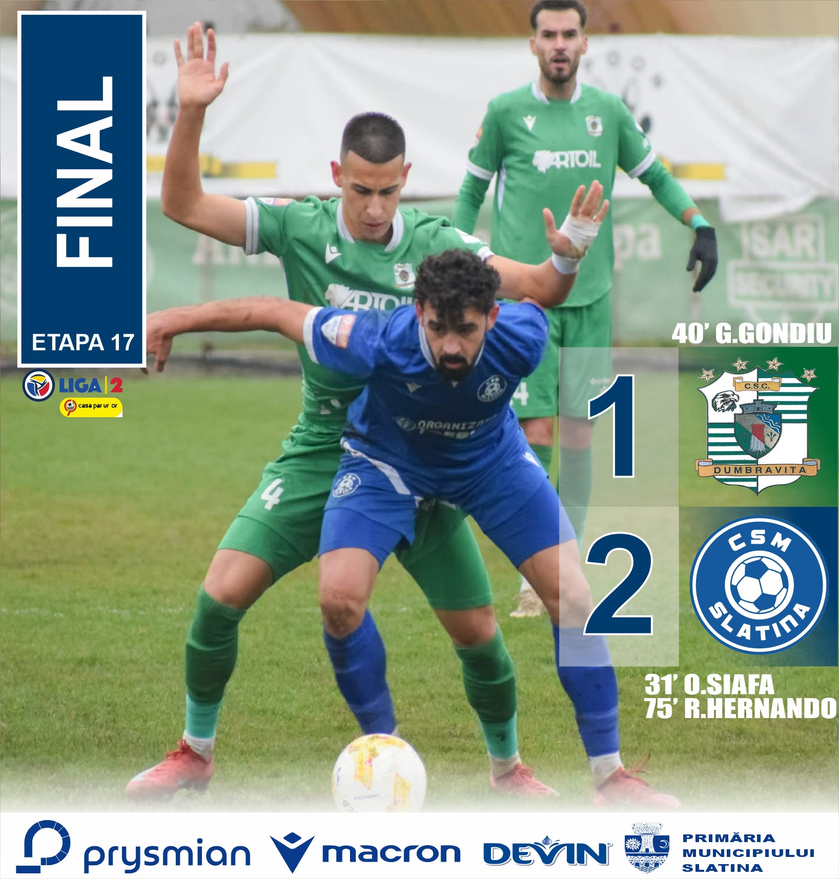 CSM Slatina a câștigat meciul disputat sâmbătă, 13 decembrie, pe terenul celor de la CSC Dumbrăvița, scor 2-1. Pentru slătineni au marcat: O. Siafa (min. 31) și R. Hernando (min. 75).