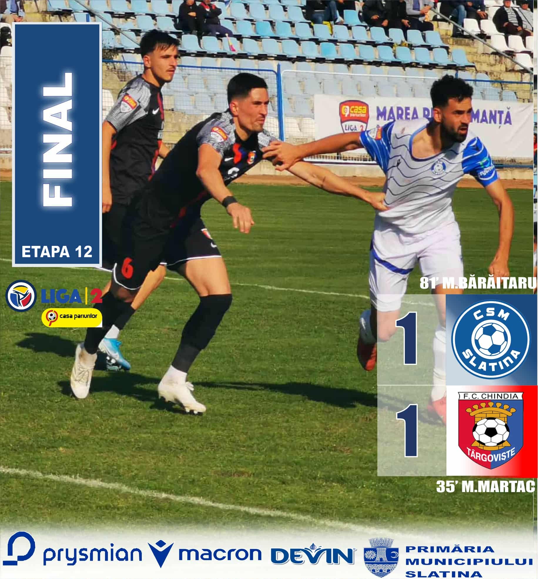 CSM Slatina a încheiat la egalitate, scor 1-1, partida disputată în prima zi a lunii noiembrie, pe teren propriu împotriva formației Chindia Târgoviște.