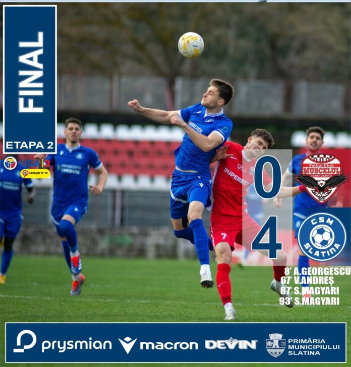 CSM Slatina a obținut o victorie clară în deplasare, scor 4-0, în fața formației AFC Câmpulung Muscel, continuând astfel seria rezultatelor pozitive din play-out.