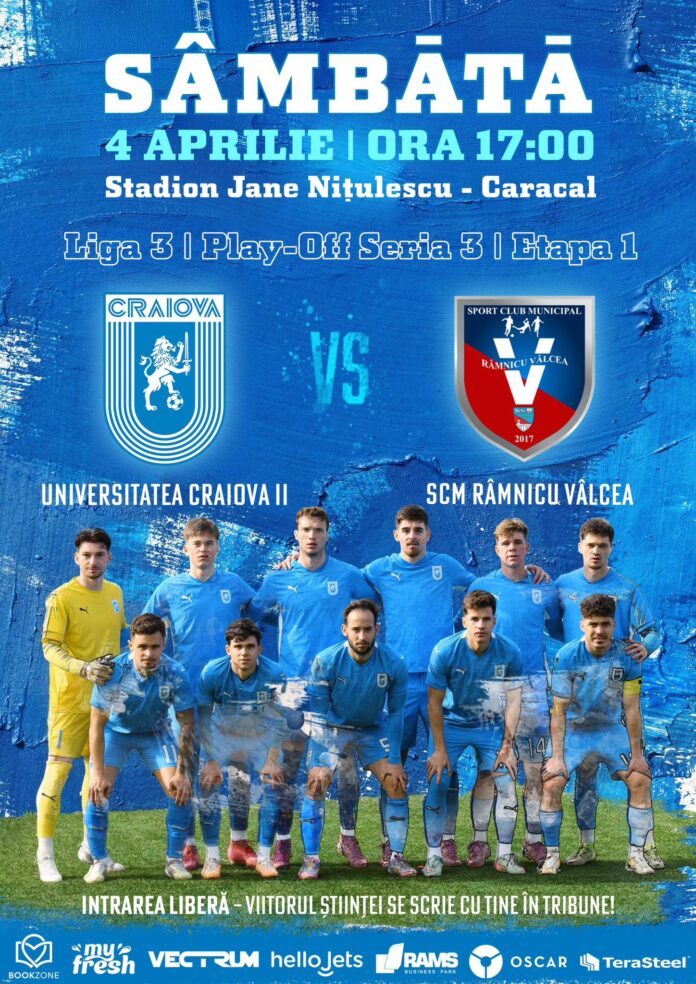 Municipiul Caracal se pregătește de un nou moment important pentru fotbalul local, odată cu startul meciurilor din play-off-ul Ligii a III-a. Sâmbătă, 4 aprilie, de la ora 17:00, echipa Universitatea Craiova II va disputa primul joc pe teren propriu din această fază a competiției.
