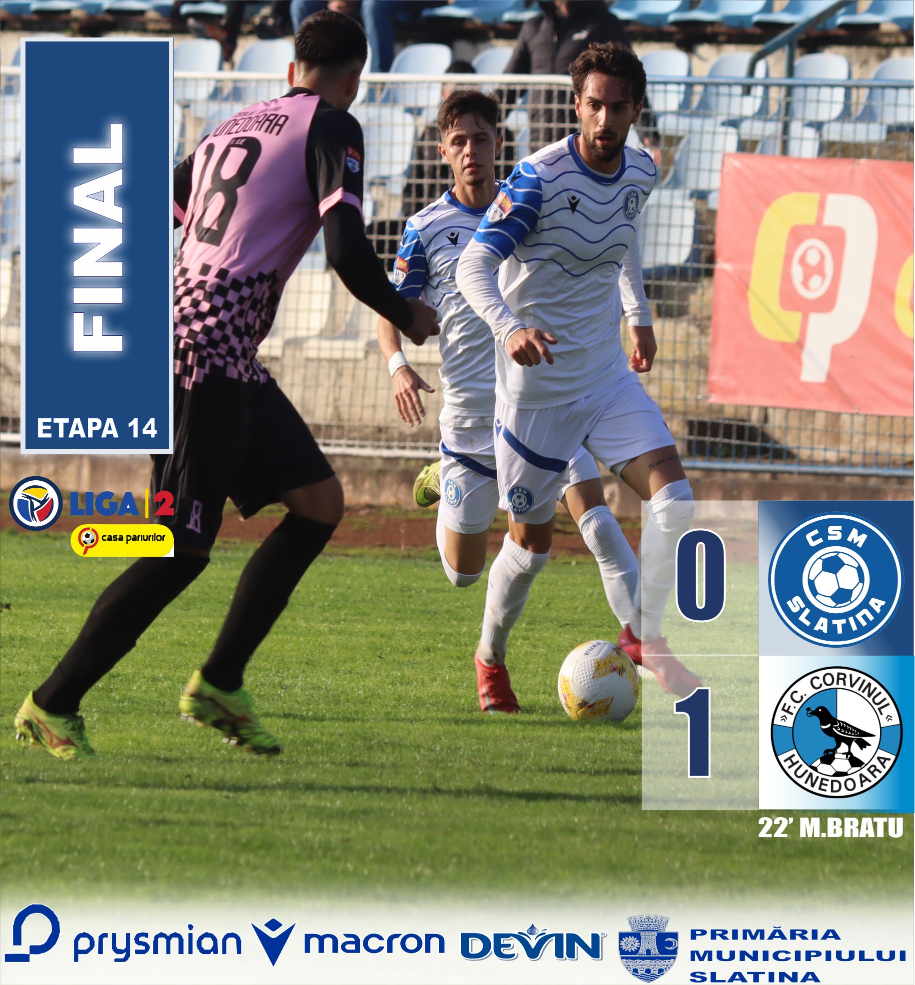 Echipa de fotbal CSM Slatina a pierdut meciul disputat sâmbătă, împotriva formației Corvinul Huneodara, scor 1-0, într-un duel din etapa a 14-a din Liga 2.