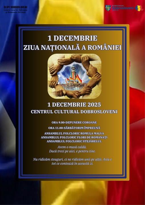 „De Ziua Națională a României, vă invităm să ne adunăm la Centrul Cultural Dobrosloveni pentru o sărbătoare trăită împreună, cu oameni dragi și tradiții care ne țin aproape. Pe 1 Decembrie 2025, începem dimineața la ora 9:00 cu depunerea de coroane, un moment de respect și recunoștință pentru cei care au scris istoria acestei țări. De la ora 11:00, atmosfera prinde viață prin energia ansamblurilor folclorice care duc mai departe sufletul zonei noastre: «Romula Malva», coordonat de coregraful Vivi Anghel, «Plai de Romanați», sub îndrumarea coregrafului Cristi Velea, «Stejărelul» din comuna Mărunței, condus de coregraful Constantin Strejescu, coordonator artistic al ansamblului fiind Mădălina Militaru. După dansuri, muzică și emoția întâlnirii cu tradiția, vă așteptăm cu o masă caldă, faimoasa fasole cu ciolan, gătită ca acasă, pentru că nimic nu apropie oamenii mai bine decât bucuria de a sta la aceeași masă. E o zi în care ne amintim cine suntem, dar mai ales că suntem împreună. Vă așteptăm cu drag să sărbătorim România în cel mai firesc și frumos mod: cu oameni, cu povești, cu energie bună și cu tradiții care ne unesc”, transmite primarul Gheorghe Tudorașcu.