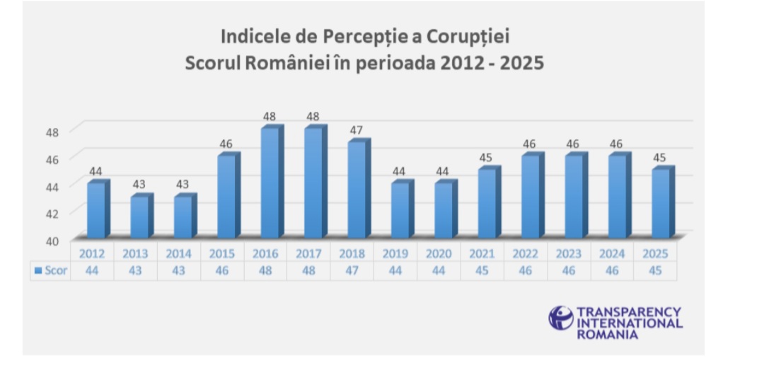 Potrivit celui mai recent raport publicat de Transparency International, România a obținut un scor de doar 45 de puncte din 100 în Indicele de Percepție a Corupției (IPC) 2025, lansat astăzi. Rezultatul marchează o ușoară scădere față de anul precedent și plasează țara noastră mult sub media europeană de 62 de puncte, confirmând o stare de stagnare care durează de peste un deceniu. Datele prezentate arată că România ocupă în continuare locurile codașe în clasamentul european, fiind la egalitate de îngrijorare cu Bulgaria și Ungaria, ambele cu 40 de puncte. În timp ce state precum Estonia sau Grecia au reușit progrese remarcabile, România a oscilat constant în jurul aceleiași cifre, nereușind să depășească pragul critic de 50 de puncte care definește democrațiile cu instituții solide.