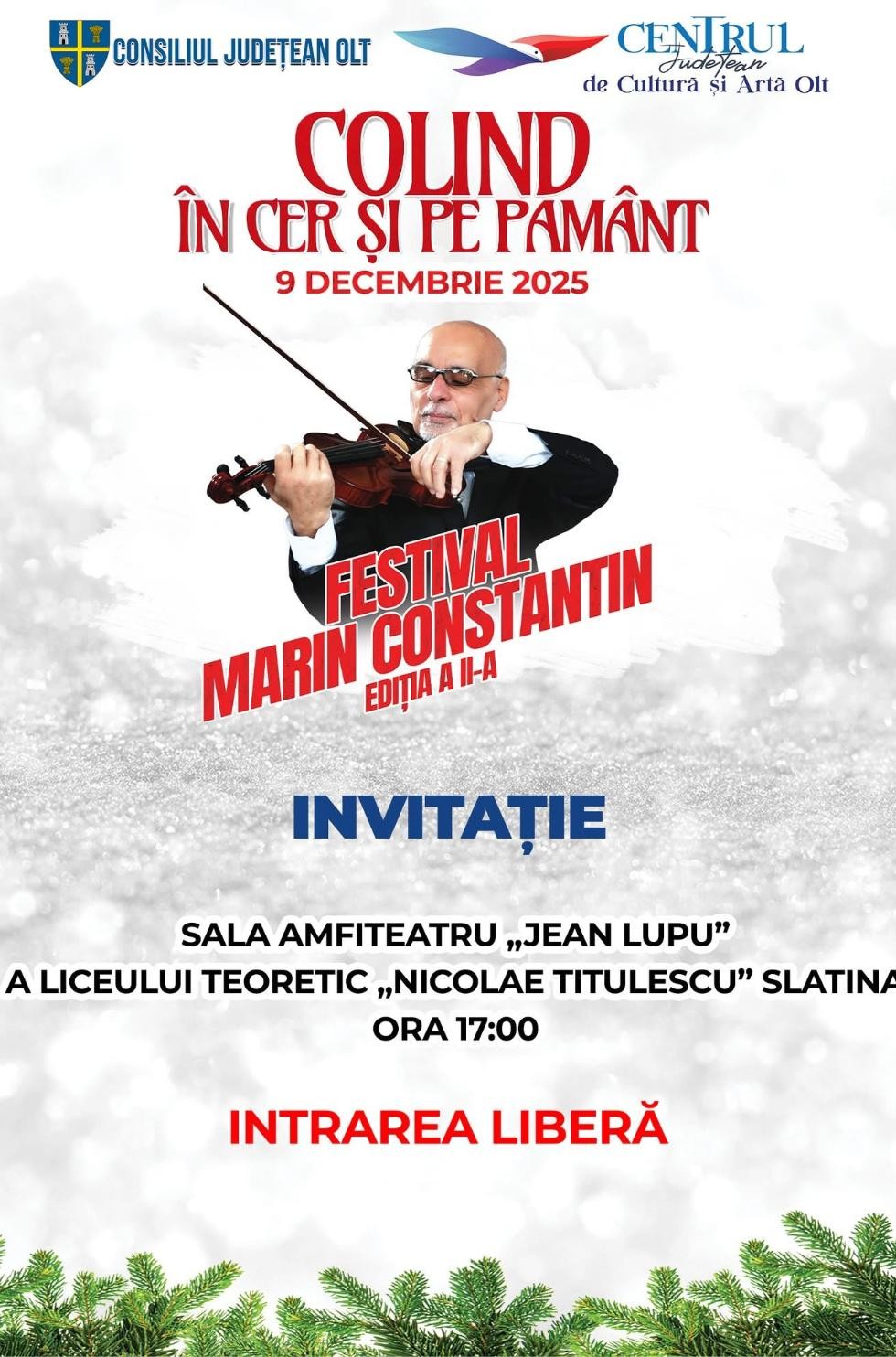 ”Vă așteptăm să ne fiți alături pentru a celebra împreună frumusețea datinilor românești, glasurile curate ale colindătorilor și bucuria Nașterii Domnului, într-un eveniment menit să aducă emoție, lumină și pace în suflete. Sala Amfiteatru „Jean Lupu” a Liceului Teoretic „Nicolae Titulescu” Slatina, ora 17:00. Haideți să ne bucurăm împreună de magia colindelor autentice și de tradițiile care ne unesc!” transmit reprezentanții centrului Județean de Cultură și Artă Olt.